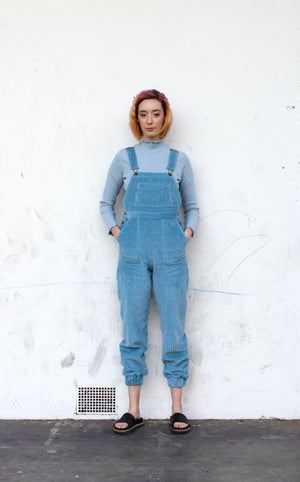 - Cornflower 100% cotton corduroy overalls with adjustable straps. Two side pockets, one front pocket and one back pocket. 00% cotton corduroy. Metal trims with antique brass finish. Elastic cuffs.