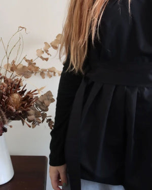- The Taybank Top is a long sleeve asymmetrical design that encompasses soft jersey wool sleeves, a cotton bodice, and extended waist ties.