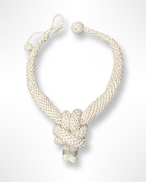 • The necklace features a crocheted Spiral Cord design with a Bull Hitch Knot pendant which closes with an adjustable Chain Stitch Loop and Monkey Fist Knot.