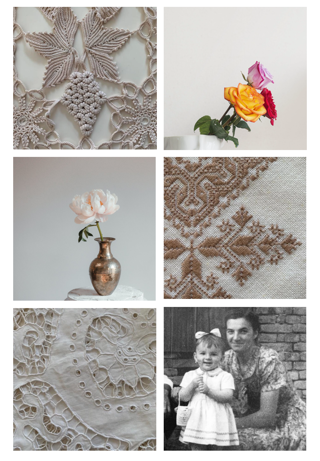 Photos of Family Heirlooms: three pieces of fine needle work embroidery by three generations of women (myself, my mother and grandmother). Freshly picked flowers, in particular roses, from our family garden continue to be fond memories of nature's beauty in our home. Bottom right corner is a loved photo of mum and I - our clothing was designed and hand made by my mother Maria.